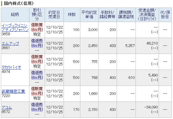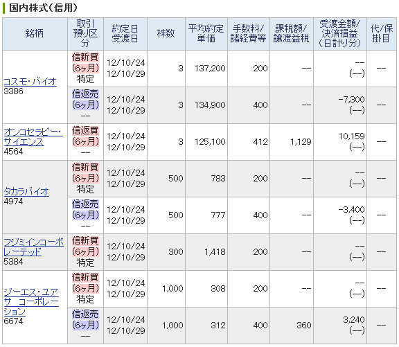 | 3386 コスモ・バイオ | 買 | 10/24 ~ 10/24 | 3 | 137,200 | 134,900 | -7,300 |