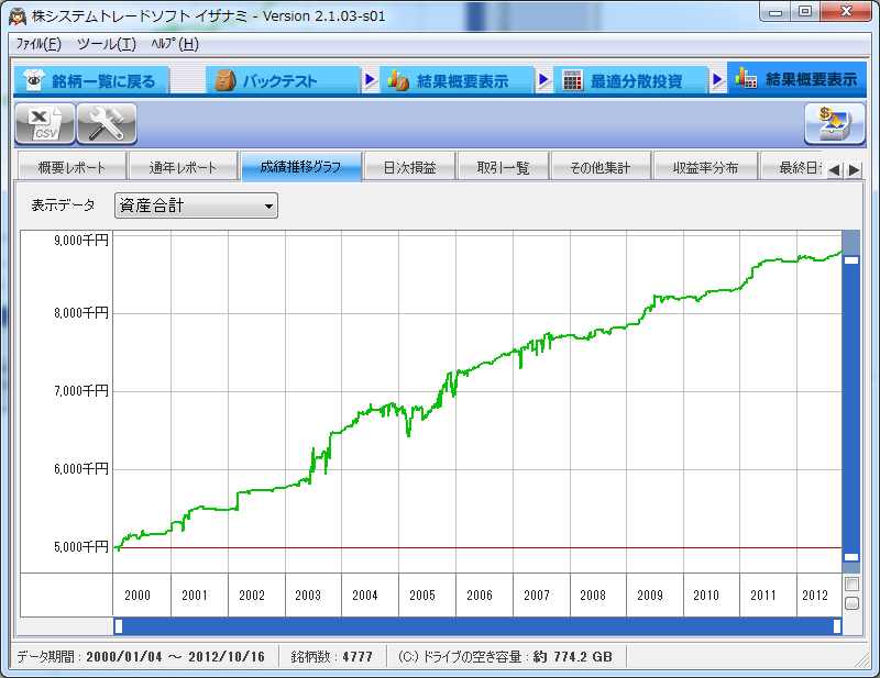 資産グラフ上で過去一番大きかった資産の落ち込みを最大ドローダウンと呼びます。多くのシステムトレーダーが気にする重要指標の一つです。過去の一番の落ち込み具合を知る事で、未来に備えて資金管理を調整します。
