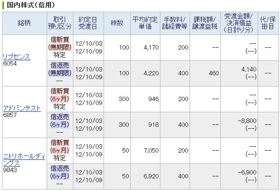 | 銘柄 | 期間 | 株数 | 建値 | 終値 | 損益 | |