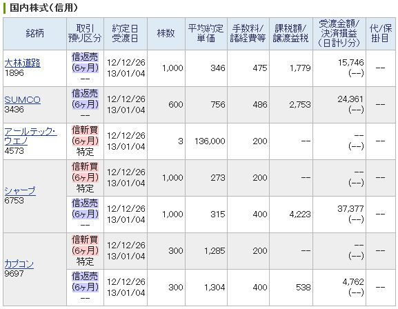 | 4573 アールテック・ウエノ | 買 | 12/26 ~ 12/28 | 3 | 136,000 | 127,200 | -26,925 |
