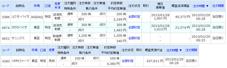 | 4582 シンバイオ製薬 | 買 | 01/31 | 800 | 518 | 512 | -4,800 |