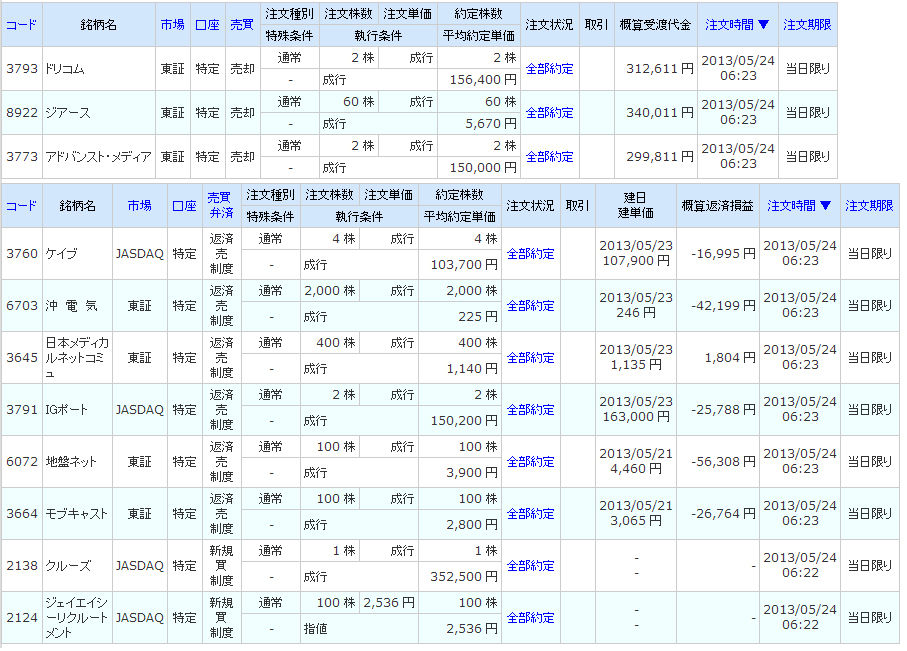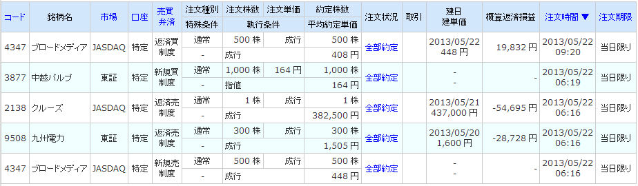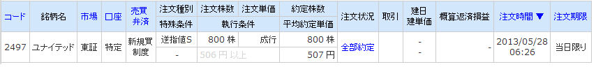 | 2497 ユナイテッド | 買 | 05/28 | 800 | 507 | 525 | +14,400 |