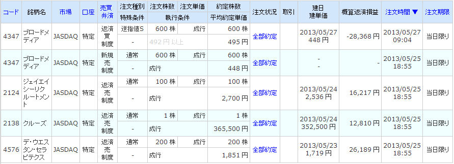 | 銘柄 | 建日 | 株数 | 建値 | 終値 | 損益 | |
