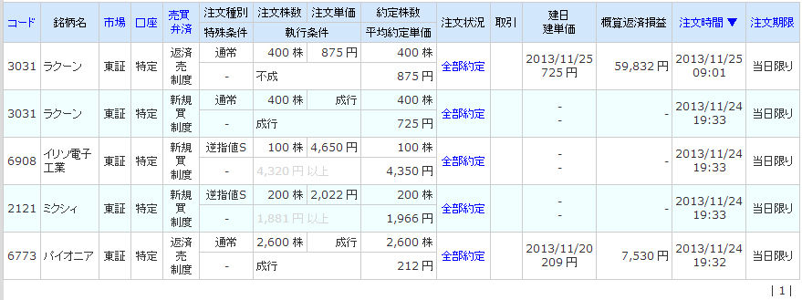 | 6773 パイオニア | 買 | 11/20 ~ 11/25 | 2,600 | 209 | 212 | +7,600 |
