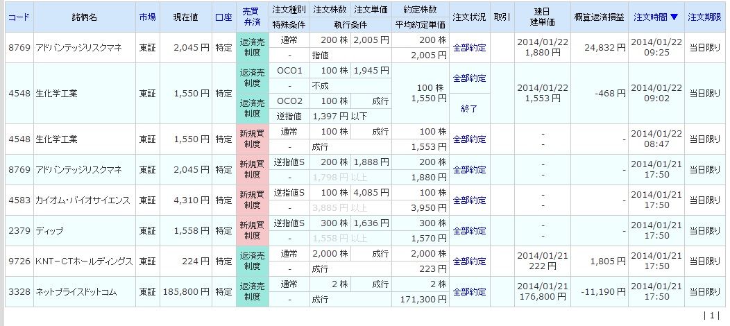 | 8769 アドバンテッジリスクマネジメント | 買 | 01/24 | 200 | 2,280 | +11,000 |