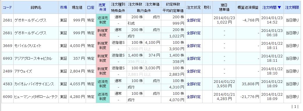 | 3046 ジェイアイエヌ | 買 | 01/27 | 100 | 3,545 | +500 |