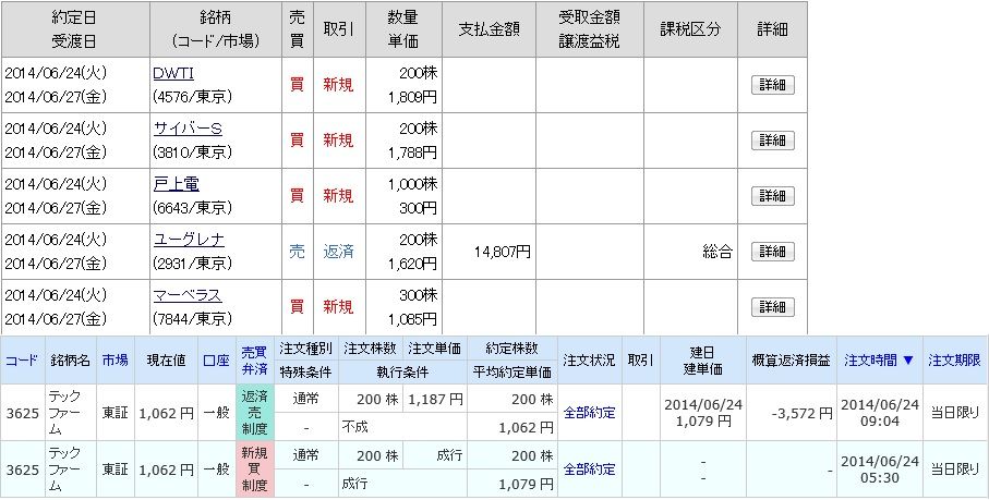| 3625 テックファーム | 売 | 06/24 | 200 | 1,079 | -3,600 |