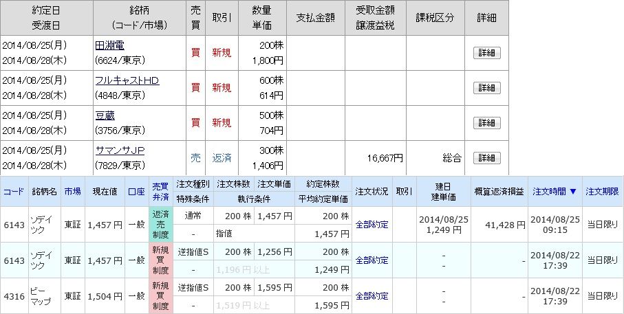 | 6143 ソディック | 買 | 08/25 | 200 | 1,457 | +41,400 |