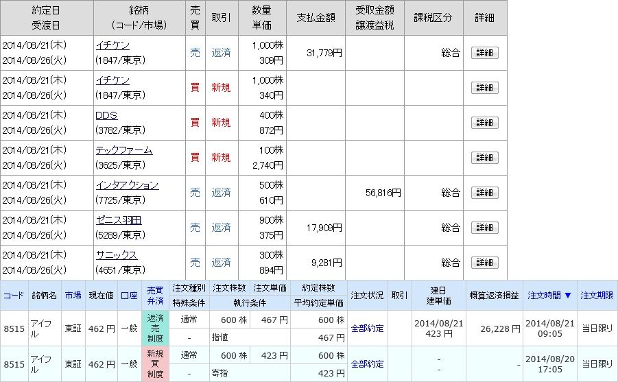 | 3782 ディー・ディー・エス | 買 | 08/21 | 400 | 872 | +26,000 |