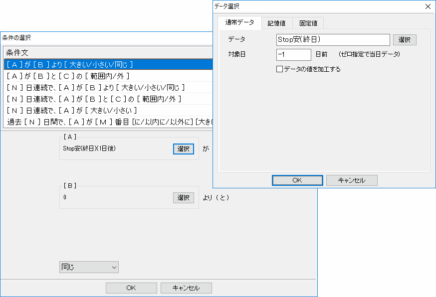 8番目の「過去[N]日間に、[A]が[B]より[大きい/小さい/同じ]日が[M]日以上[存在する/存在しない]」をご利用の場合、「過去N日間に、指定の条件に一致した日がM日以上あったらOK」という条件となります。