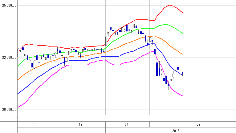 ボリンジャーバンドを引いてみるとこんな感じ。
