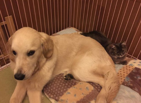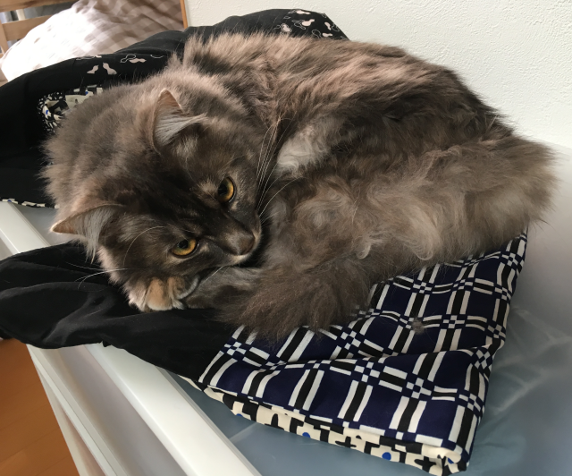 ダンボールに潜り込んで遊ぶ猫のミワさん。