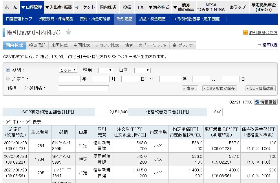 いくら得したのかは楽天証券HP>口座管理>取引履歴>SOR価格改善のページで確認できます。