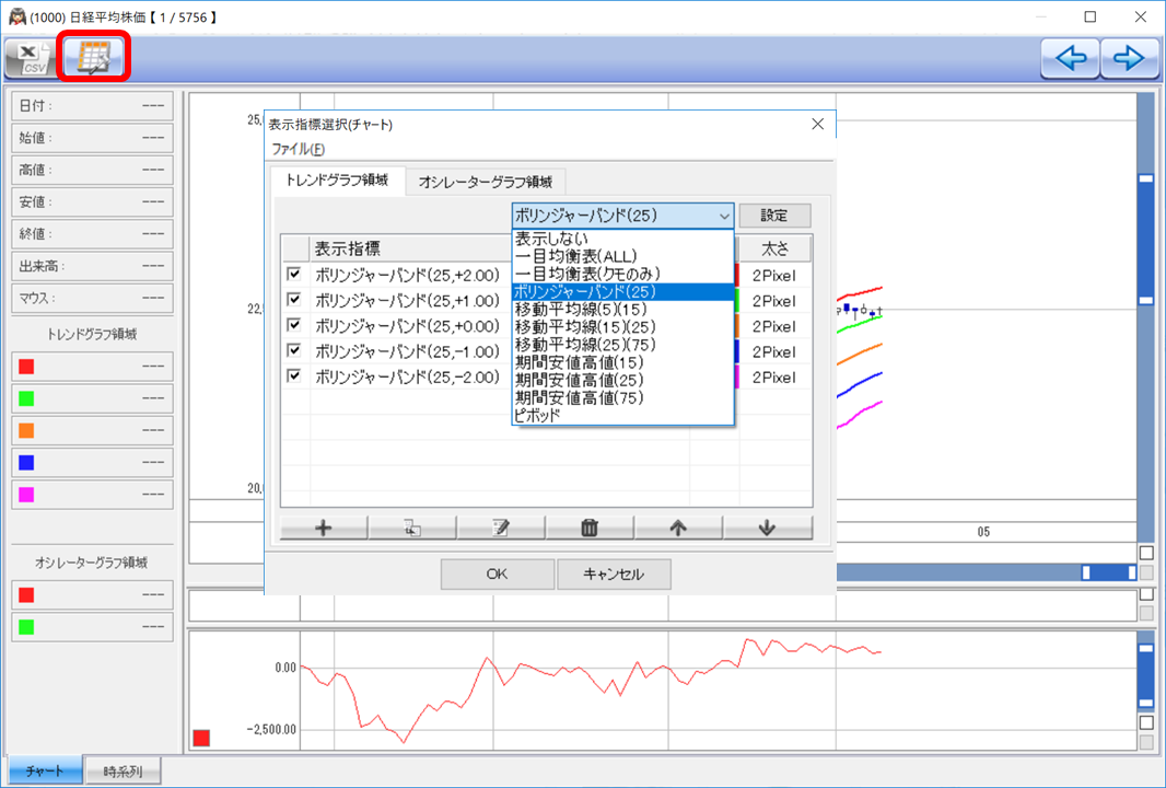 チャートの画面で表示指標設定のボタンを選択して表示されるダイアログで