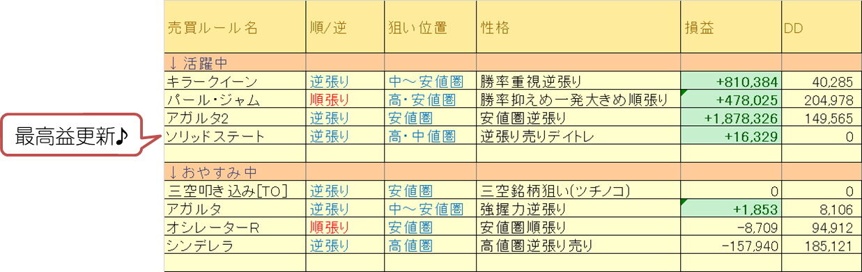 TO戦略も買い戦略でダメージがありましたが、逆張り売りデイトレ「ソリッドステート」が大きく利確!ついについに最高益更新を果たしました!ブラボー!!!