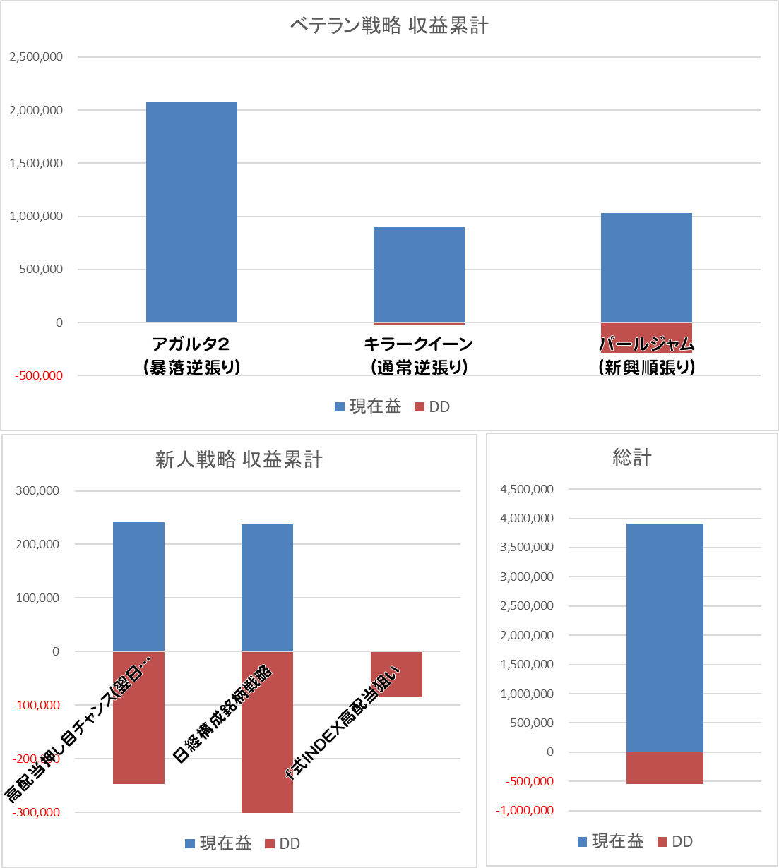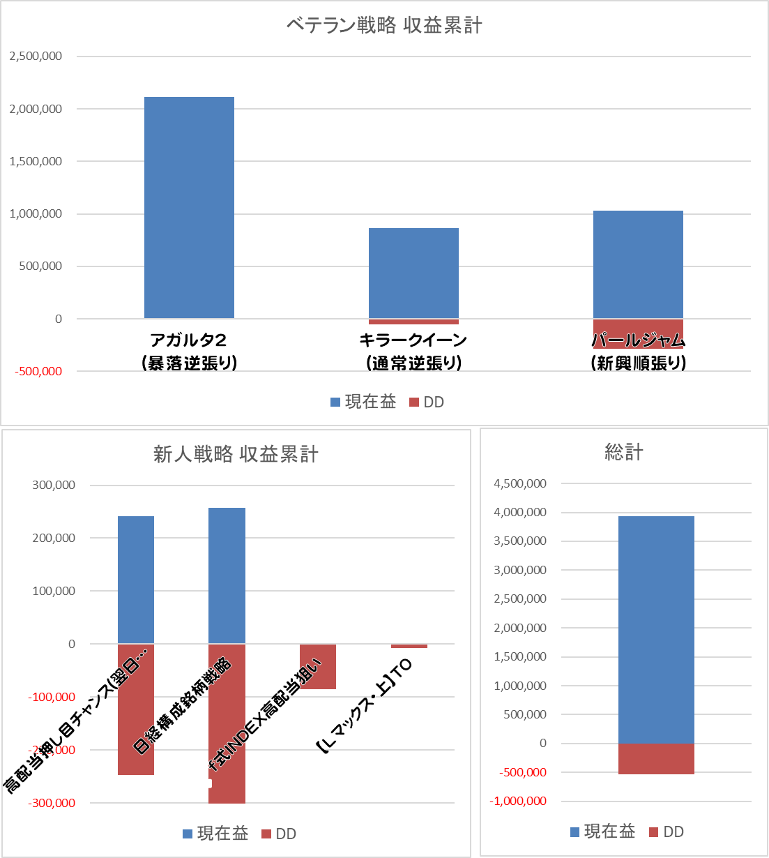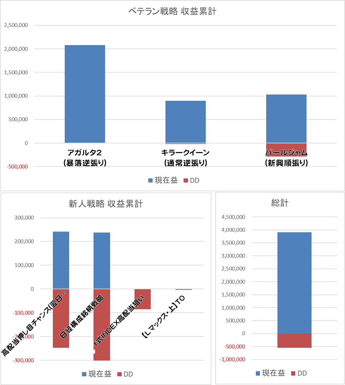 相場全体も下げてるので大損失かと思いましたが、他の逆張り銘柄がしっかり稼いでくれたので全体的には損益-1万円未満という快挙を成し遂げました。
