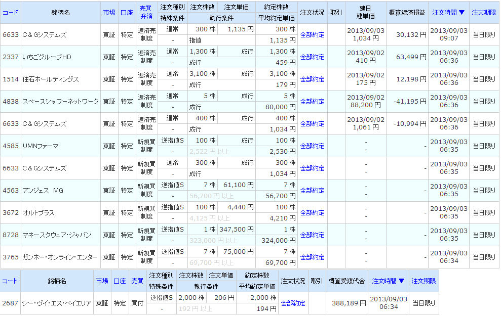 <6633>C&Gシステムズが2回手仕舞っているように見えますが、一つは昨日(9/2)仕込んだ分の損切り。これでも特買いギャップアップしてるので損失は大分減ってます。