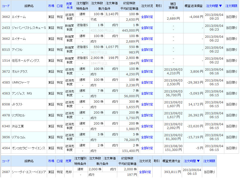 | 3662 エイチーム | 買 | 09/04 ~ 09/04 | 100 | 2,689 | 2,650 | -4,100 |