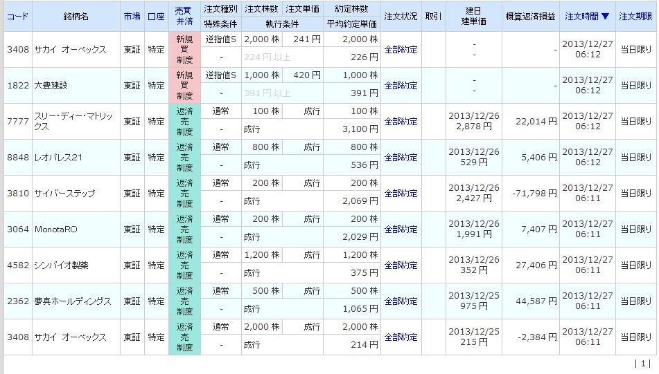 | 銘柄 | 建日 | 株数 | 建値 | 終値 | 損益 | |