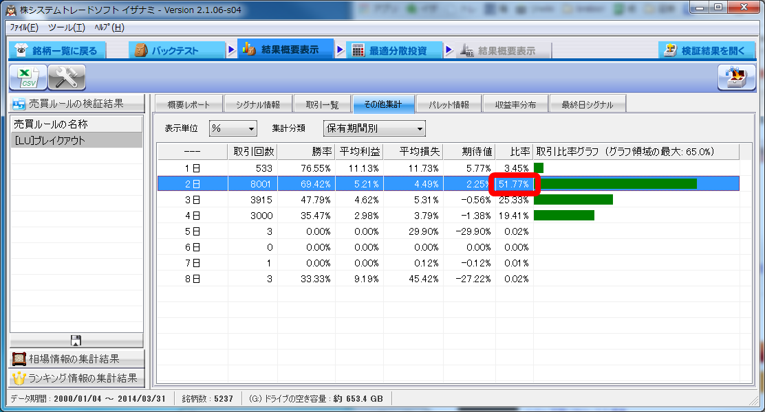 例えばこの間まで使っていた戦略[LU]ブレイクアウトは以下のように2日手仕舞いの割合が多かったので、手仕舞いは「中」と判断します。
