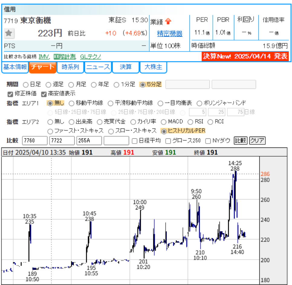 他にも分足チャートを見て不審な値動きの銘柄をピックアップ。