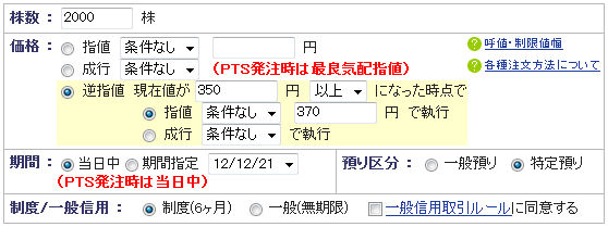 SBI証券の逆指値注文画面