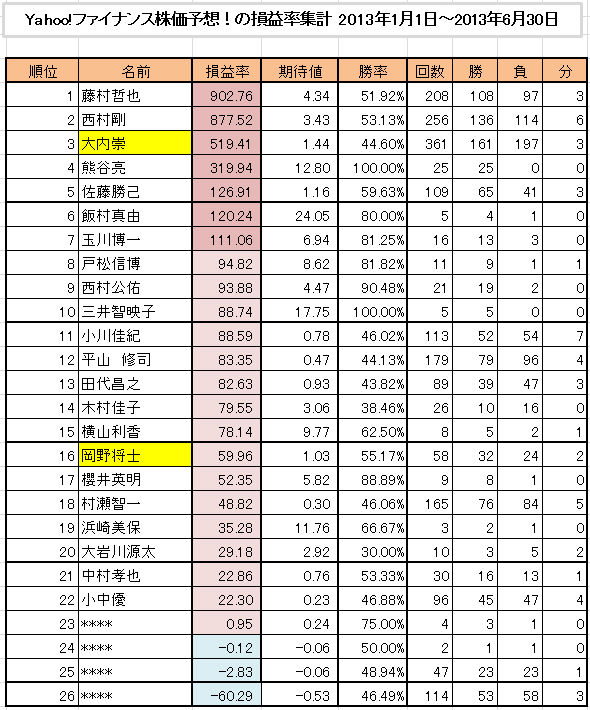というわけで前回に引き続き、2013年1~12月の各達人の「損益率」を集計してランキングしてみました!